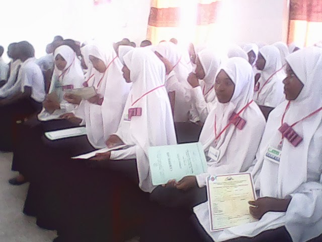 Baadhi ya wanafunzi wanaotarajiwa kufanya mitihani yao ya taifa katika Skuli ya Fidel Castro,wakipokea vyeti vya kumaliza kidato cha nne kutoka Mkuu wa Mkoa wa Kusini Pemba,Mh. Juma KassimTindwa.